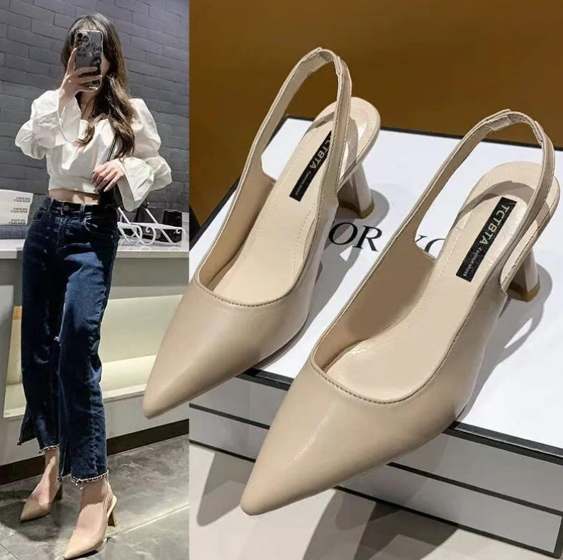 รองเท้าส้นสูงสตรีหนังนิ่มใหม่หัวแหลมสายรัดรองเท้าแตะแฟชั่นลำลอง