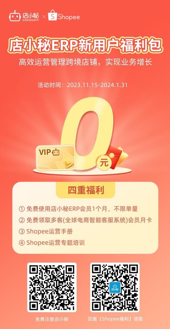 蓝海兴盛,红利仍在!为帮助卖家全力备战2023下半年旺季,Shopee从产品、营销、服务等多方面推出了多项扶持举措。为此, Shopee携手店小秘ERP,特别推出了新用户福利,旨在通过全流程跨境电商SaaS解决方案,帮助卖家高效运营管理跨境店铺,实现业务增长。 店小秘成立于2014年,是一家全球领先的电商IT服务公司,