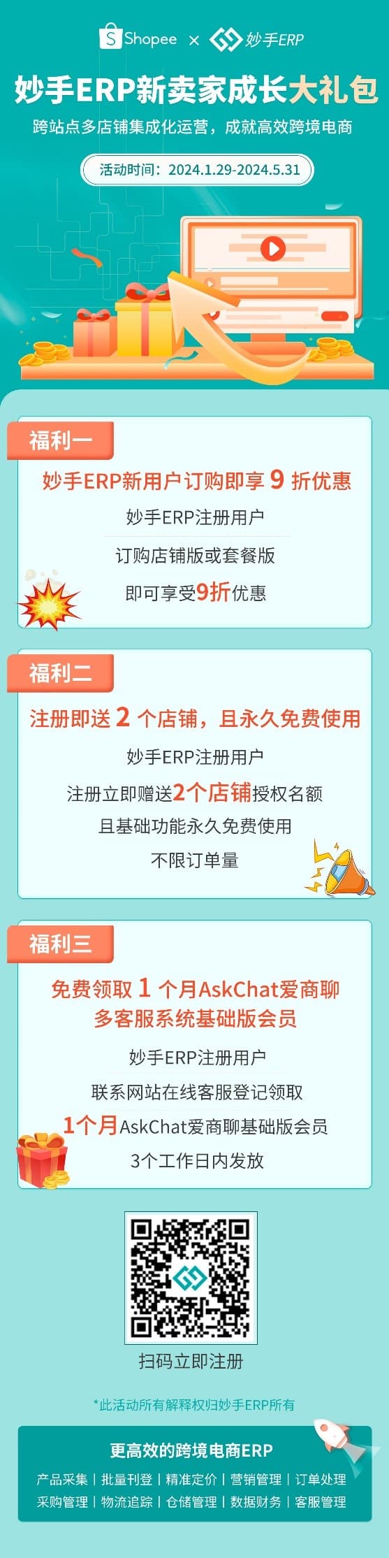 2024开年之际,Shopee官方从“广度、深度、速度”三个方面升级了新一年的发展战略,并推出了一系列的利好政策。 为帮助卖家高效布局2024年,妙手ERP携手Shopee官方,特别推出新卖家成长大礼包,全方位助力Shopee卖家高效运营跨境店铺,出海大卖。 妙手ERP,始创于2014年,现已服务超60万跨境卖家,致力